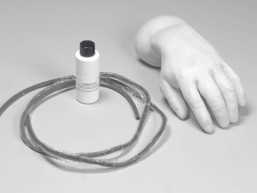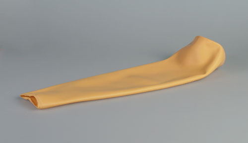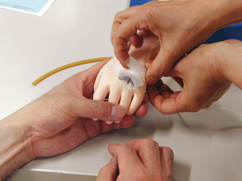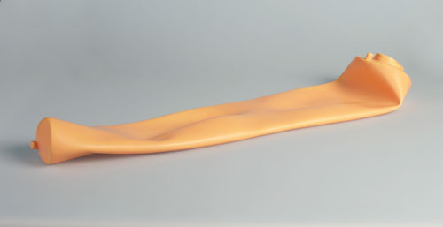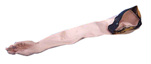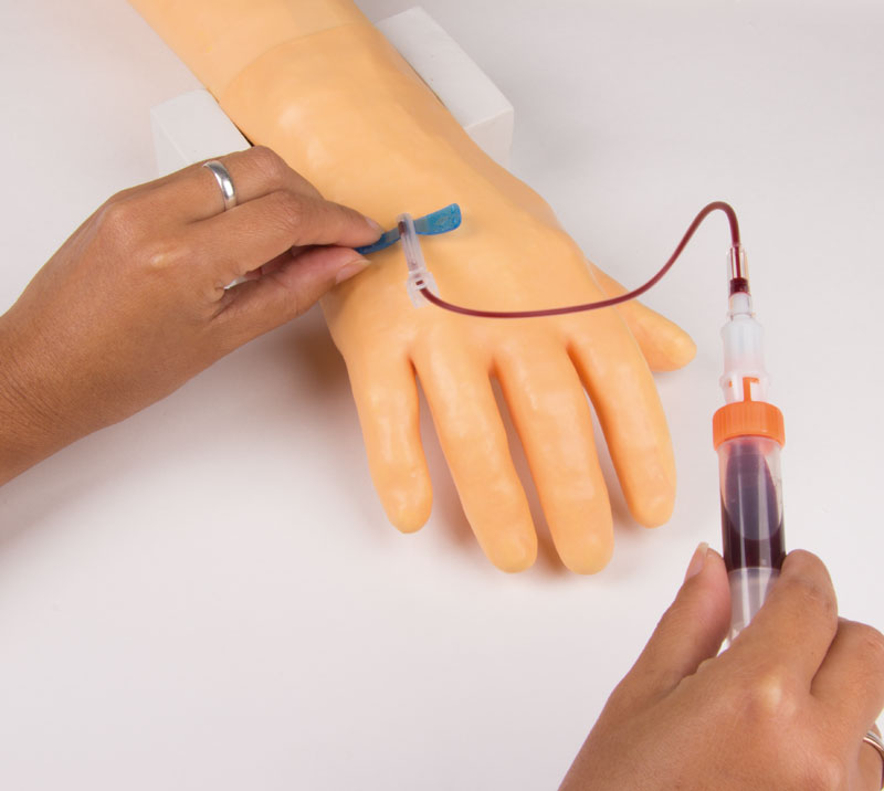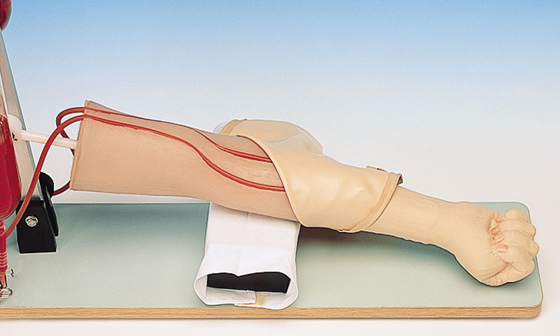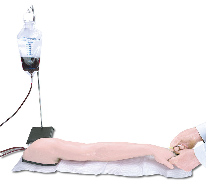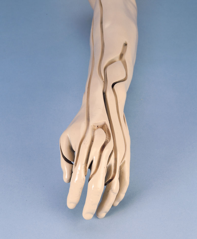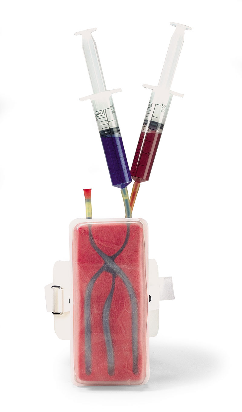 Dieses Modell hat eine spezielle, extrem dünne synthetische Haut, einen Venenschlauch mit entsprechend kleinem Lumen und dünner Gefäßwand. Die V. cephalica accessoria und V. basilica sind zugänglich, wie auch die Venen auf dem Handrücken. Lieferung mit zwei Flüssigkeitsbeuteln, künstlichem Blut und einem Infusionsset.