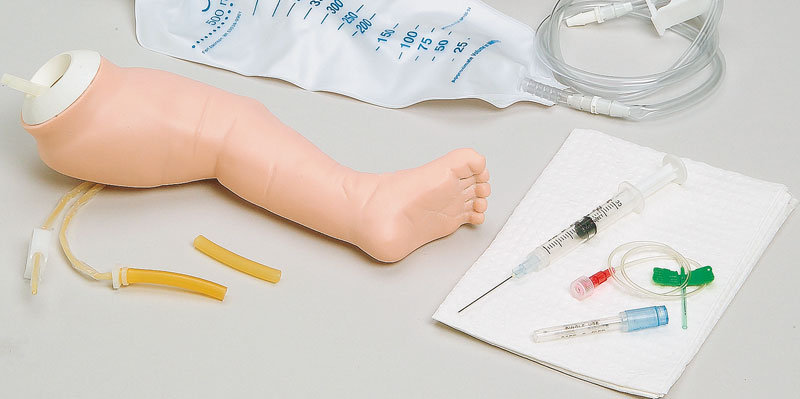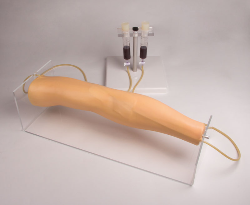 Dieses Modell hat eine spezielle, extrem dünne synthetische Haut, einen Venenschlauch mit entsprechend kleinem Lumen und dünner Gefäßwand. Die kleine und große Rosenvene sowie der venöse Bogen des Fußes sind zugänglich. Lieferung mit zwei Flüssigkeitsbeuteln, künstlichem Blut, Spritzen und einem Infusionsset.