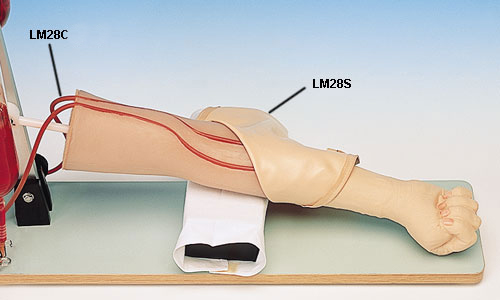 Das Injektionsmodell soll dem angehenden Arzt und dem medizinischen Hilfspersonal die Möglichkeit geben, die intravenöse Injektionstechnik zu üben. Das Modell besteht aus einem weichen Kunststoff mit einer auswechselbaren Haut sowie einem auswechselbaren Injektionsfeld in der Ellenbeuge in welcher die mittlere Ellenbogenvene (V. mediana cubiti) durch einen Schlauch nachgebildet ist. Unter der Haut ist die Vene sichtbar und kann außerdem leicht ertastet werden. Im Modell sind die Spannung der Haut und die Beschaffenheit der gestauten Vene in etwa wirklichkeitsgetreu nachgeahmt. Das Modell zeichnet sich besonders durch die Möglichkeit aus, daß die Vene realistisch gestaut und durch Aufbringen von Gleitmittel eine Rollvene simuliert werden kann. Erprobt im harten täglichen Einsatz bei der Bundeswehr. Alle Einzelteile sind einzeln erhältlich.