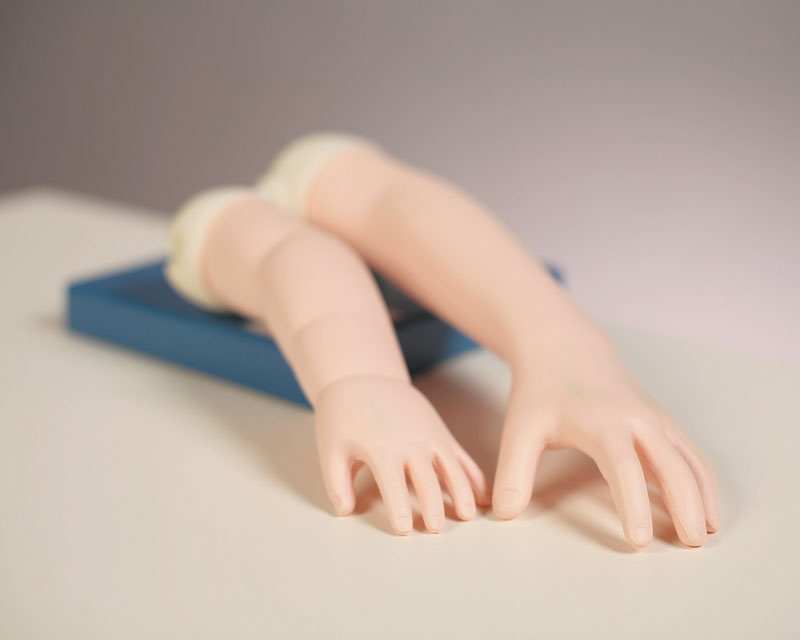 Lebensechte Reproduktion des rechten Arms eines sechsjährigen Kindes. Das Modell bietet die Möglichkeit des Übens von intravenösen und intramuskulären Injektionen. Im Oberarm befindet sich ein künstlicher Knochen zur Orientierung bei der intramuskulären Injektion. Die Venen und die Haut können bei Bedarf ausgewechselt werden. Lieferung mit Aufbewahrungskoffer.